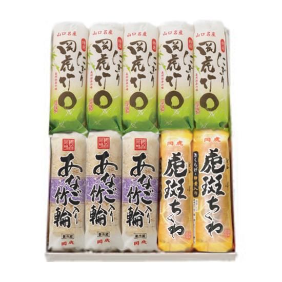 岡虎の看板商品『にぎりちくわ』5本と滋味深い『あなご入り竹輪』3本とほのかな甘味と磯の香りが特徴の『虎斑ちくわ』2本の詰合せです。